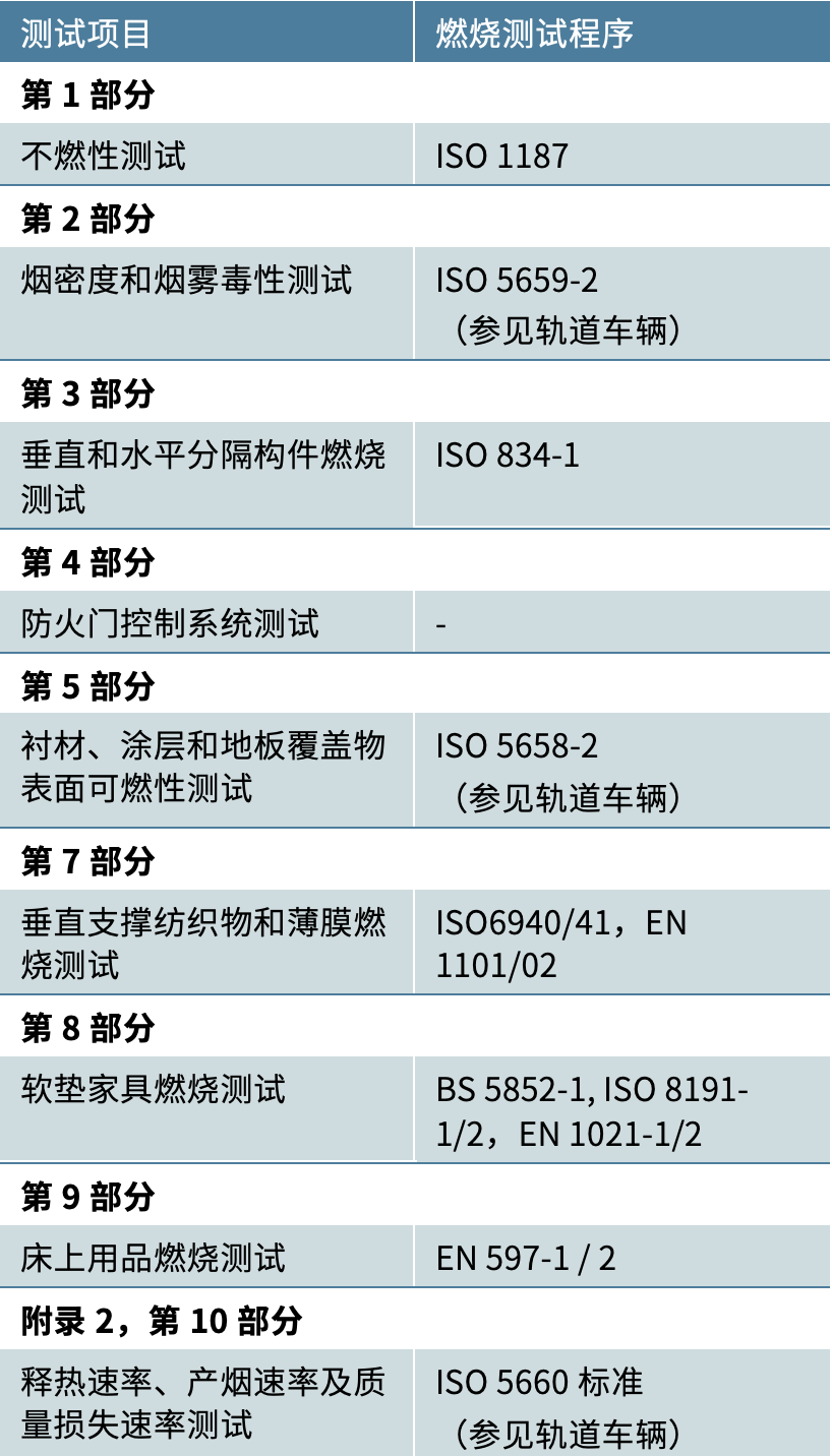 根据国际海事组织第 MSC 307(88)号决议,国际海事组织颁布实施了新的燃烧测试程序规则 - 《2010 年国际燃烧测试程序应用规则 》(2010 FTP Code)。该规则涵盖了船舶和游艇材料及部件的燃烧测试。该规则的各相关部分及相应标准列于下表。